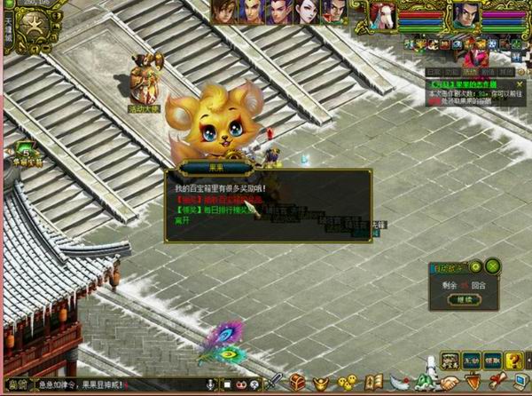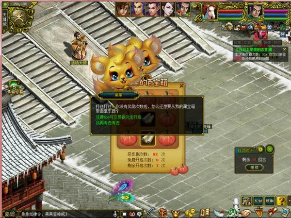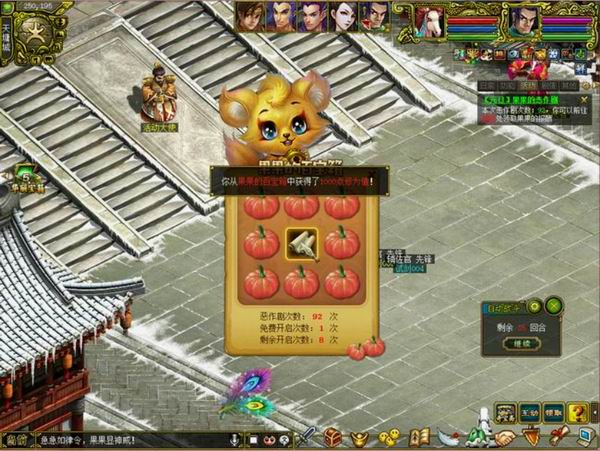 3.在玩家恶作剧的时候有概率触发果果的提问,若答对问题则会增加5次恶作剧次数,答错没有惩罚; 4.当恶作剧次数达到40次以上可以找果果抽取奖励(注:每达到40次可获得一次免费抽奖次数),如免费抽奖次数用完,玩家可花费金元宝点开其他宝箱,每次需要花费500金元宝,每日最多开启9个宝箱。