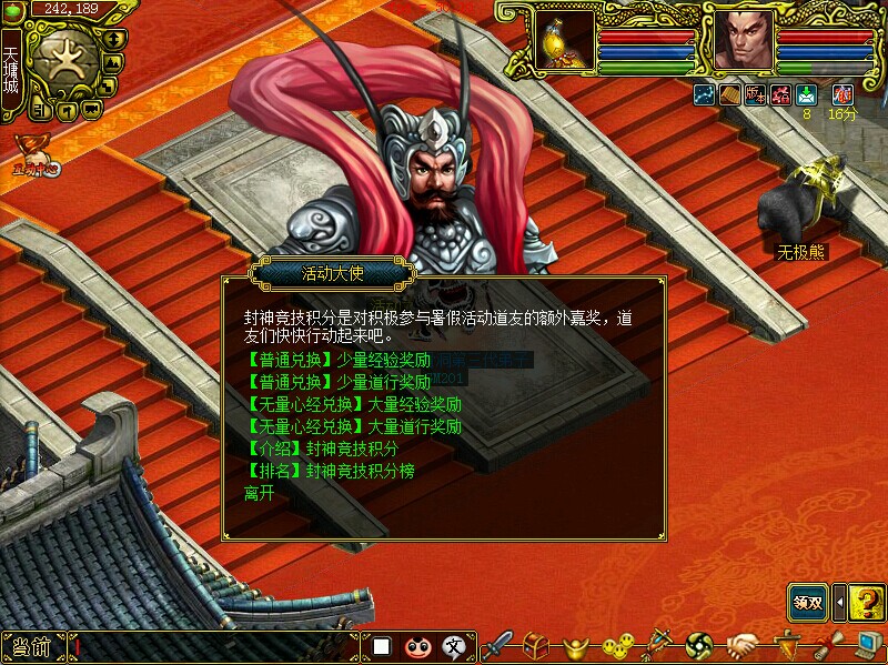 2、到活动大使处,选择“封神竞技积分”,可以兑换经验和道行奖励,使用20点竞技积分和1本无量心经则可以获得大量的经验和道行数值奖励。