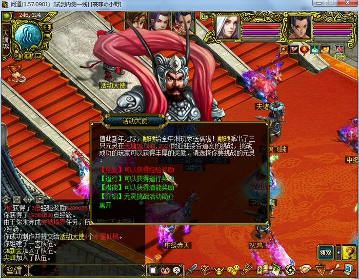 值此新年之际,颛顼给全中洲玩家送福啦!颛顼派出了三只元灵在天墉城(248,202)附近迎接各道友的挑战,挑战成功的玩家可以获得丰厚的奖励,选择你要挑战的元灵吧。