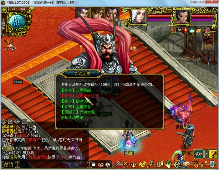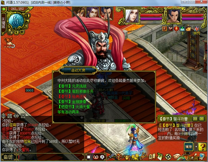 猴年新年即将到来,问道与众道友一同过新年!只要你完成了天墉城、无名小镇、揽仙镇、东海渔村的四值功曹的考验,就能获得大量数值奖励哟!