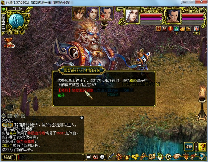 1、玩家组队前往活动大使处领取驱赶邪崇任务,领取任务后寻找五方仙兽,协助其驱赶邪祟;